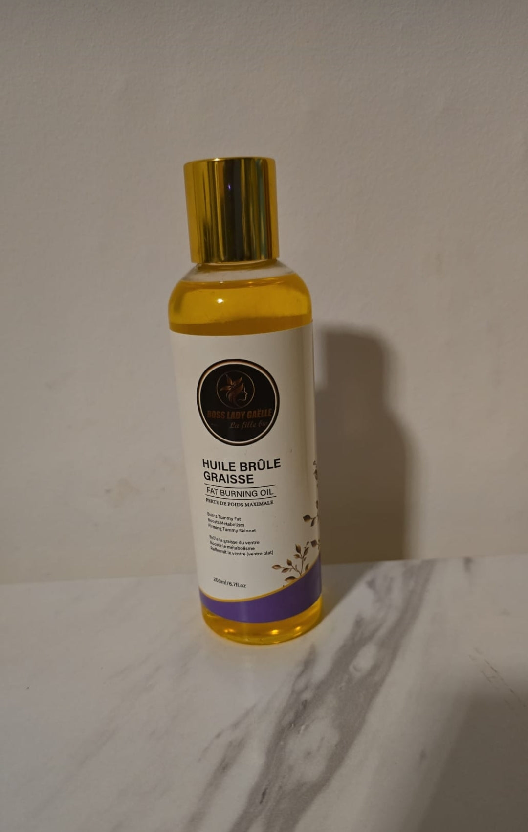 3. Huile Brûle Graisse : Appliquez sur les zones ciblées et massez jusqu'à absorption complète pour un effet raffermissant.